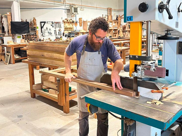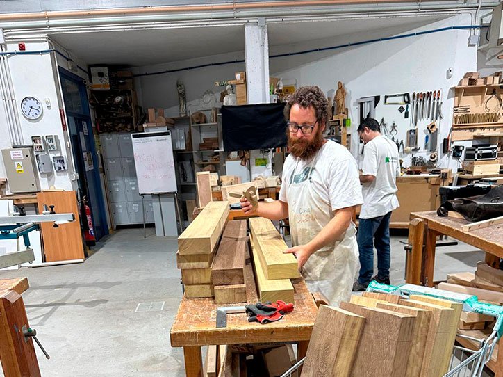 Over the course of four weeks of intensive work, Guillermo deepened his understanding of both traditional and modern woodworking machinery, including fixed and portable tools such as the band saw, table saw, jointer, thickness planer, mortiser, router, jigsaw, and power planer. He also studied safety regulations and the proper use of personal protective equipment. His training included visits to specialized hardware stores and lumber suppliers, allowing him to become familiar with the processes of selecting materials and tools essential to the craft.