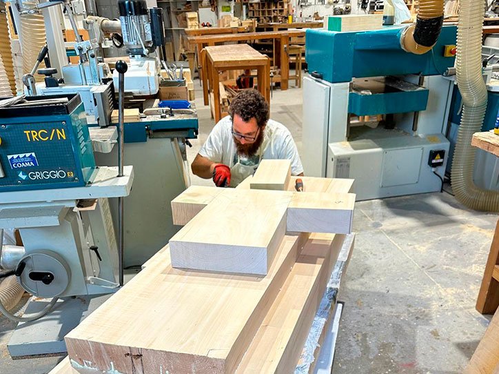 Among the activities carried out, highlights include the preparation and gluing of wood using different adhesives, the squaring and planing of pieces, and the fabrication of large blocks in limewood intended for a sculpture approximately two meters tall. He has also worked on the construction of fixed and casement windows, crafting frames, sashes, rebates, and glazing beads for the installation of glass, as well as hinging work using a router on iroko wood.