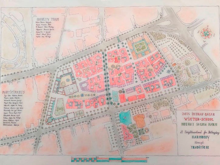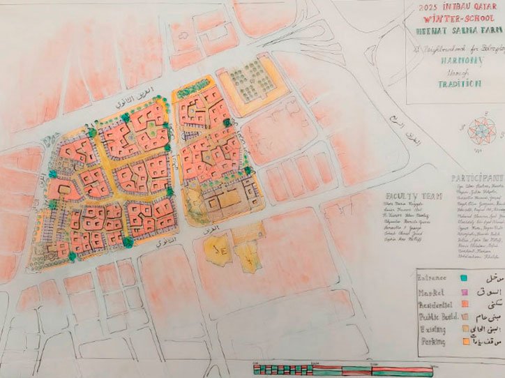 The school culminated in the exhibition Neighborhoods For Belonging. Harmony Through Tradition , which presented the results of two weeks of intensive work focused on urban and architectural design grounded in traditional references. The project developed proposes a new model of urban development based on the region’s historical strategies of urban and architectural design, envisioning neighborhoods that extend and update the local architectural culture, are more walkable, better adapted to local climatic conditions, and more socially inclusive. The work was conceived as a master plan vision for a neighborhood in the city of Doha, designed to address contemporary needs through a culturally rooted approach.