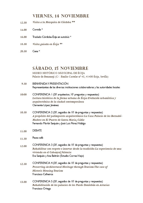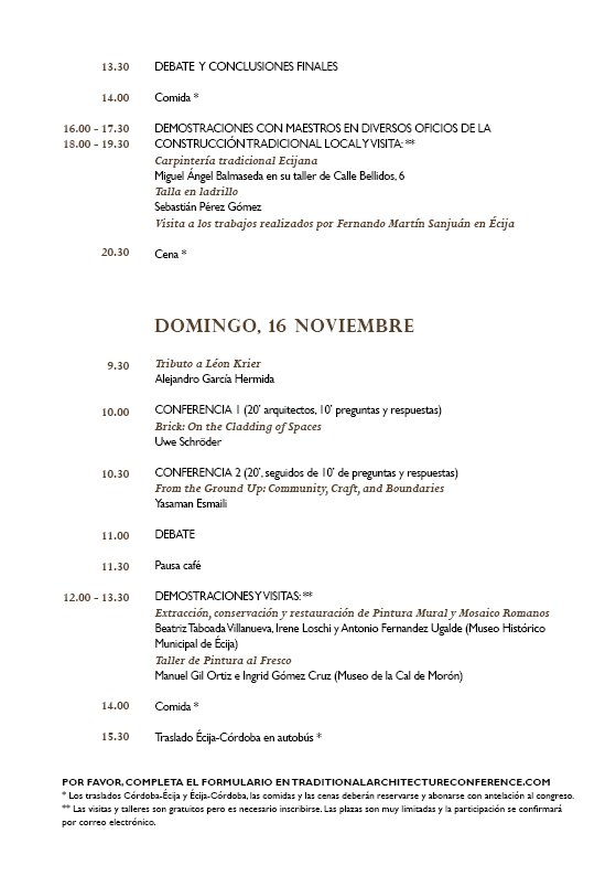 Este ano, o congresso será realizado presencialmente em Écija, entre os dias 14 e 16 de novembro. O programa presencial incluirá debates, conferências de arquitetos internacionais e demonstrações conduzidas por mestres dos ofícios da construção tradicional. As apresentações abordarão os diversos temas propostos no âmbito do congresso.